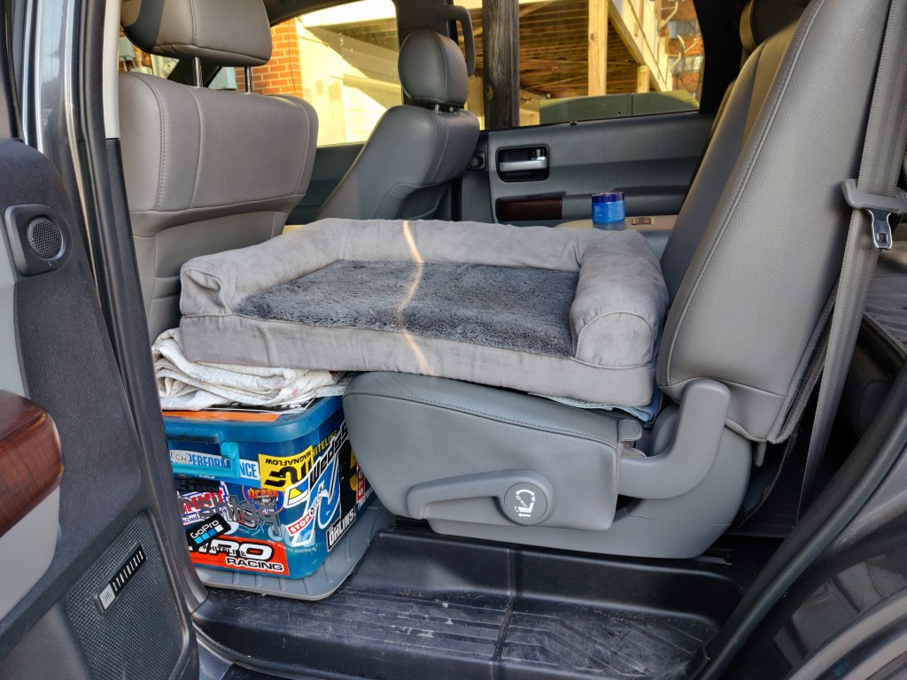 - After graduating, I took my dog back with me as I no longer travel every Friday-Saturday. As a double bonus for him, I work from home now and pretty much spend the entire day with him. We got a nice seat setup for him in one of the captains chairs, as he travels with us when I go on track days. The old autox box I use fits perfectly in front of the seat, and with some blankets we have a nice level for him and a smaller bed that he can hang out on on our drives. This also prevents him from scratching up the leather seats.