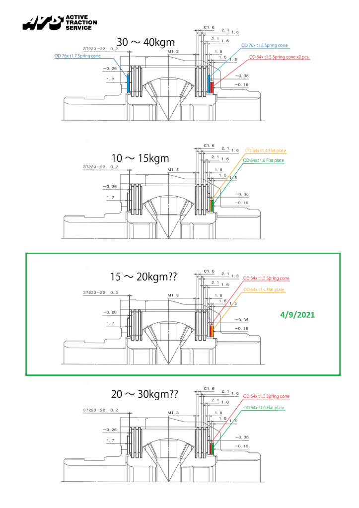 The stock ATS front differential comes with 30-40kgm of preload – this is a lot of preload. A big part of why they are able to get away with it is due to their carbon disks, which allow for smooth engagement even with a lot of preload. This works great in the rear diff, but it’s been causing a good amount of clunking in the front. As such, I’ve removed one of the spring disks with a 1.4mm flat washer supplied by ATS to reduce the clunking. This also reduces the preload down to 15-20kgm of preload, which is still a lot of preload. I’ve noticed that at very low speeds the front differential wants to bind, causing some drag. This should then reduce any understeer I may see on turn-in/sharp turns out on track as well, sacrificing some lockup on acceleration. I don’t think there will be much if any wheel spin even on this setup, but we will see. The front of the Evo is always heavily loaded and the amount of time that the wheels will be at a severe angle while also accelerating should be minimal as well.