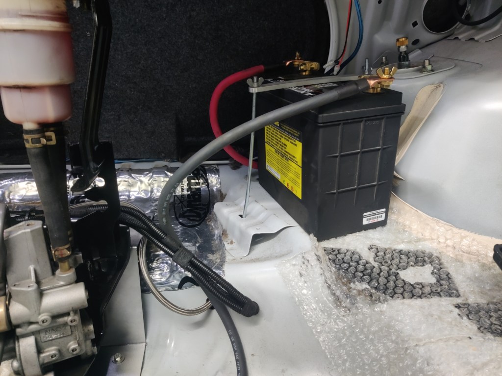 This off-season is primarily going to be focused on improving the Evo’s balance. The Evo needs any help it can get in the balance department. The entire ACD pump has been relocated to the trunk, for a shift of 20 lbs off the front and 20 lbs onto the rear. Likewise, the battery has also been relocated to the trunk. Though the battery is a lightweight Antigravity battery, it still weighs 12lbs, as I received the wrong (extra capacity battery) – it works out though, as that also removes 12lbs from the front to the rear – total of 32 lbs off the front and into the rear. It’s not much, but it’s still a net 2% shift – 1% off the front, 1% added to the rear. 32lbs of improved balance is not too bad. This also opens up some space up front.