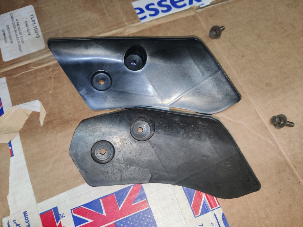 With the recent loss of the brake ducting, I’ve returned to relying on the OEM brake air guides for the Evo. From what I understand, in conjunction with the undertray, these should work pretty well. Interestingly enough, looks like my lower flap had broken off on the driver’s side. Never noticed – probably happened after going off track or running over a cone. There’s a perforation on the back of it for the lower piece to snap off with ease.
