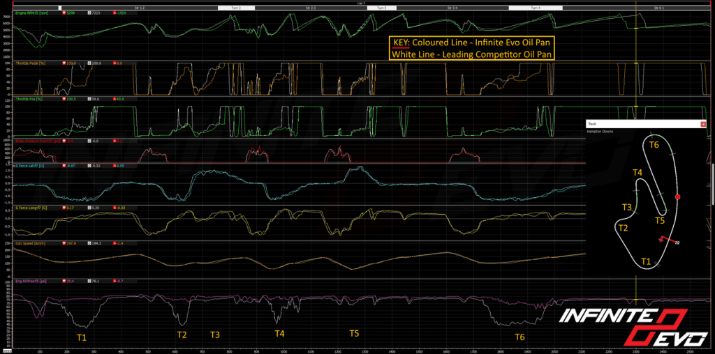 In the image below, the bottom purple line shows the oil pressure of the InfiniteEvo (purple line) vs. the Racefab (white line). Given the differential, it is perhaps feasible to consider that maybe my Evo’s issues were also caused by losing oil pressure and therefore oil starve in corners..