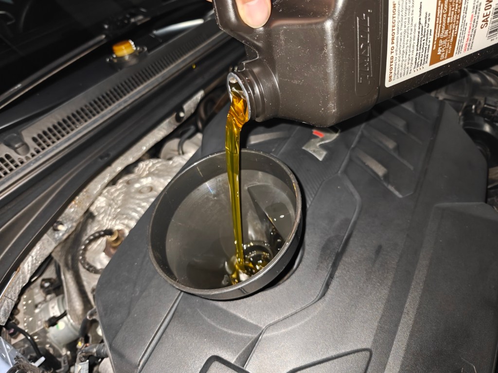 6. Refill the oil (4.8 or 5qts depending on spec). Use a funnel to prevent making a mess, the coil packs and spark plugs are just under this cover. Replace the oil cap once filled.