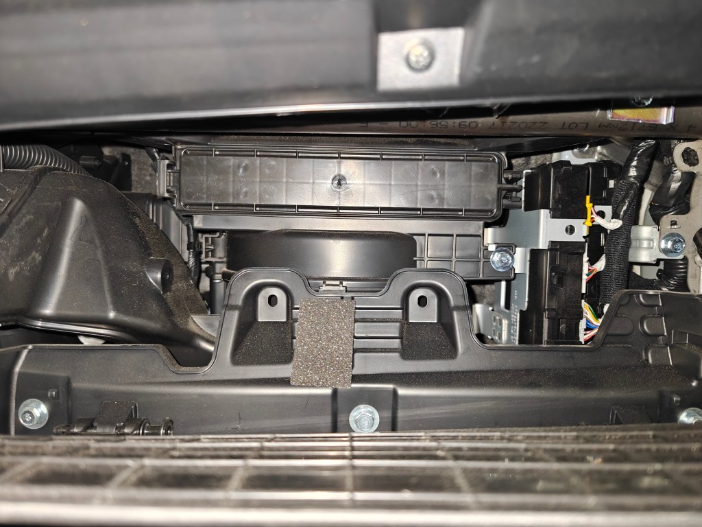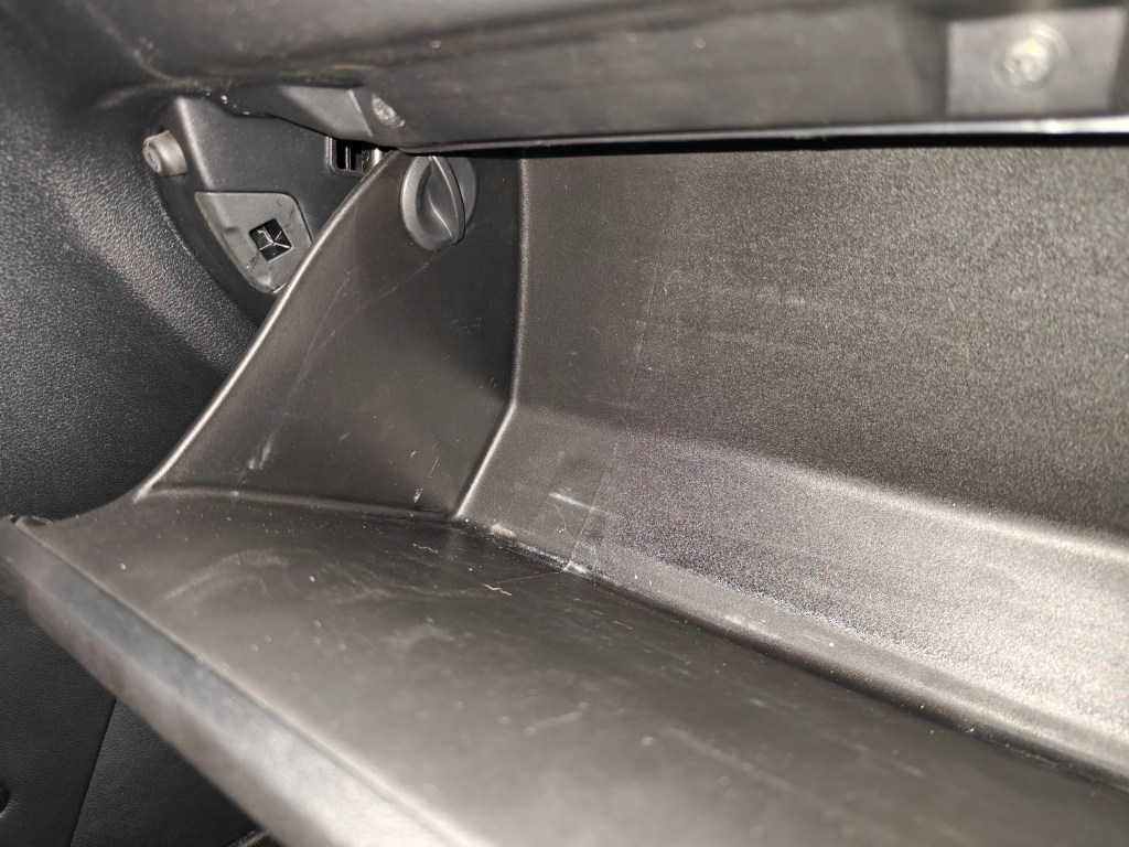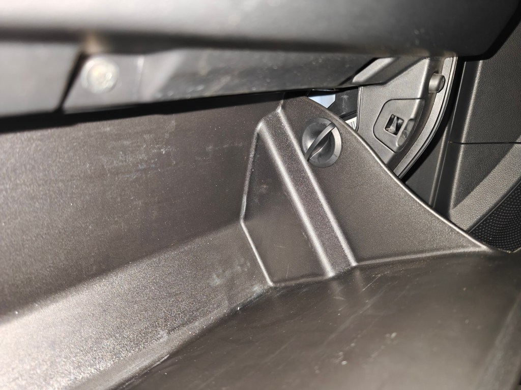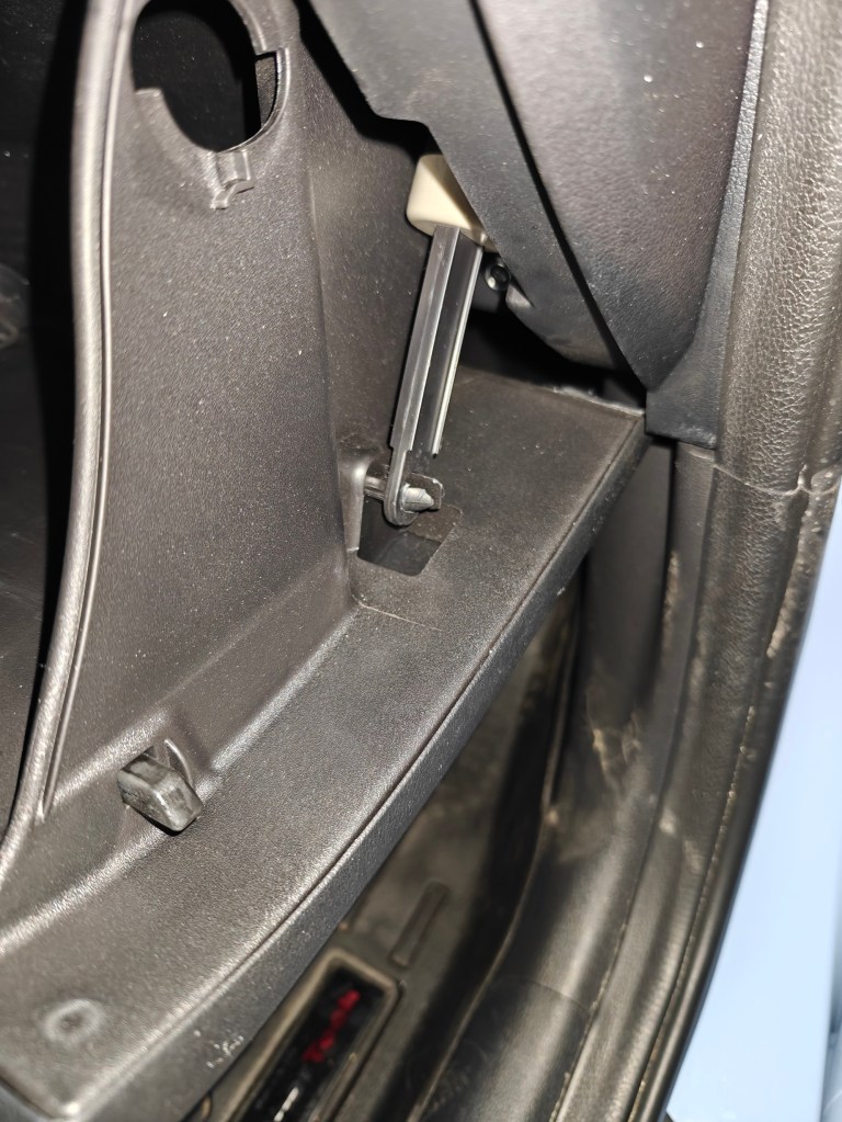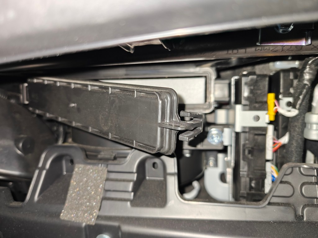3. After removing the two end plugs, the glove box will lower but is still connected by this arm. I’ve seen some people pinch this closed first, but I had to use the pliers here. Once you squeeze the clip, it can be disconnected from the arm.