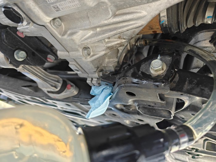 - Once under the car, make sure you can access/break loose the 17mm fill plug first. I had to get a new tool in order to accomplish this. It’s in a very tight spot, behind and above the axle on the driver’s side, with some kind of metal upright connected to the subframe blocking access further.