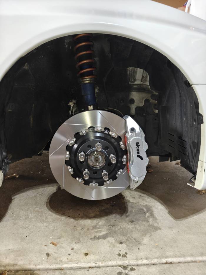 Brand new setup for the remainder of the 2025 season. It became clear over the last couple of events that going from the Evo 10 brakes to the AP Racing setup (350mm to 325mm) was a bit of a downgrade in terms of overall braking force. The pedal was firm and I could stand on the brakes but the car didn’t want to stop the way I wanted it to. I’ve upgraded the brakes from the AP Racing 4-piston 8350s with 325mm rotors to Alcon’s Car97 6-piston calipers with adapters for the 355mm kit. This will be a much more competent setup for both track and autox. While I think the AP Racing set would have been good for track, autox involves much more hard braking at colder temps. The AP Racing kit actually decreased the front braking force by about 6% – not the direction you want to go on a 60/40 car that makes 100-140whp more than factory. I got two sets of pads, the P3 & the P5. Descriptions of Paragon’s pads are here. The P3 pad is a DS2500 equivalent, bit of a do-it-all street, autox, and light track duty pad. I’ve also got the R5 pads for if the car needs to setup to those – but given the performance on the DS2500s, I think I will be ok for now. Unfortunately, it does require the caliper to come off to swap in new pads due to how the retaining clip and mounting tabs are designed, but not too much of a deal – just 2 10mm hex bolts that need to come off. I debated between the 343mm to run 17s and the 355 to commit to 18s, but ultimately for the track, I wanted a bigger, more capable setup that would also be a bigger heatsink.