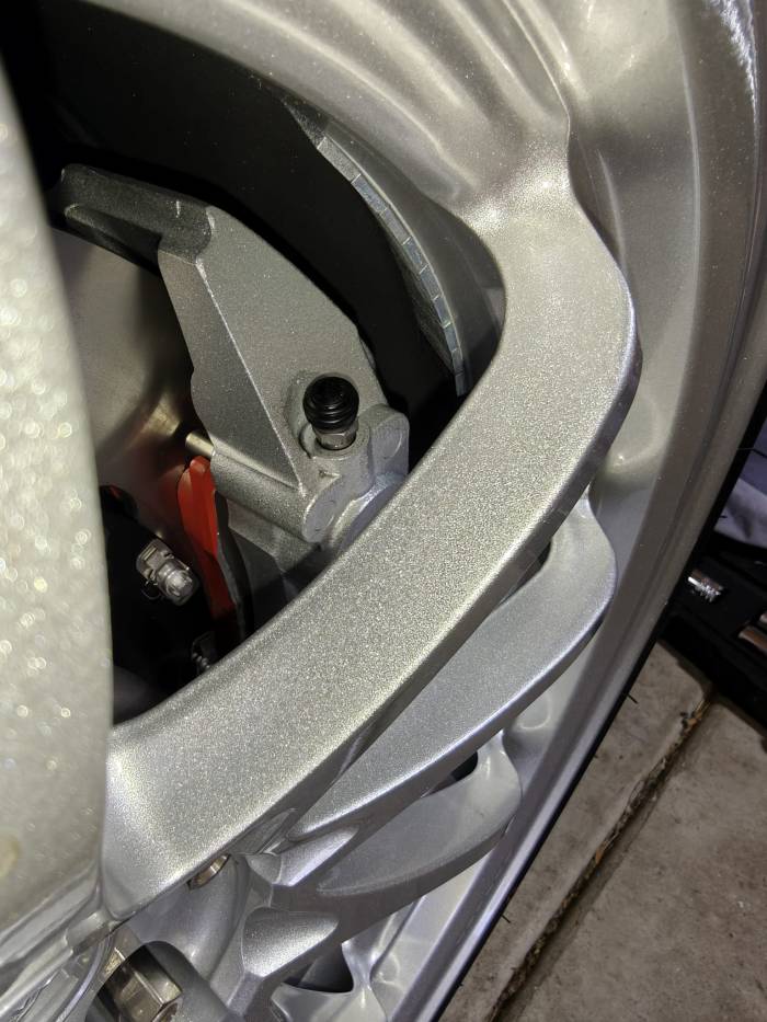 Obviously a lot of the actual stopping power comes from the tires but already had RE71RS in 255s on the car – so that was upgraded too. Going from 325mm rotors to 355mm rotors meant I needed to return to 18s. I had sold all of my 18s when I switched from the Evo 10 brakes to the APs, so I needed to grab a set. As luck would have it, Rays recently released a new, revised CE28 – the CE28n-plus. The CE28n-plus is a stronger, more rigid wheel than the original. The weight savings holes around the hub area are gone, and most of the wheel is revised, despite keeping the same design. Likely, these are similar to the CE28SLs that I had. Unlike the CE28SLs which only came in Diamond Dark Gunmetal, I was finally able to choose the color I wanted – this time, I went for Diamond Silver. I hate dark/black wheels, and had always planned to powdercoat them silver. My preference is always for a metallic, bright silver, which is exactly what the Diamond Silver color is. If anything, I think it could have been a little more metallic and a little less satin-y, but that’s nitpicking. I checked the old CE28n’s I had in Mercury Silver, and I prefer the DS. I actually kind of miss the holes around the hub, but I’ll take greater strength in the wheel any day of the week. These are also an 18×10 +40 wheel, which meant two modifications – the SSB rear trailing arms for inner clearance in the rear, and extended studs in the front to run a 12mm spacer (bringing the offset to 28). This turned out to be a perfect fit for both front and rear clearance. I could MAYBE fit a 285 if I ran a little less camber in the front and rear, but that’s something to think about in the future. There’s also a massive amount of clearance to the brakes which is a good thing – more airflow around all the bits means more cooling as well.